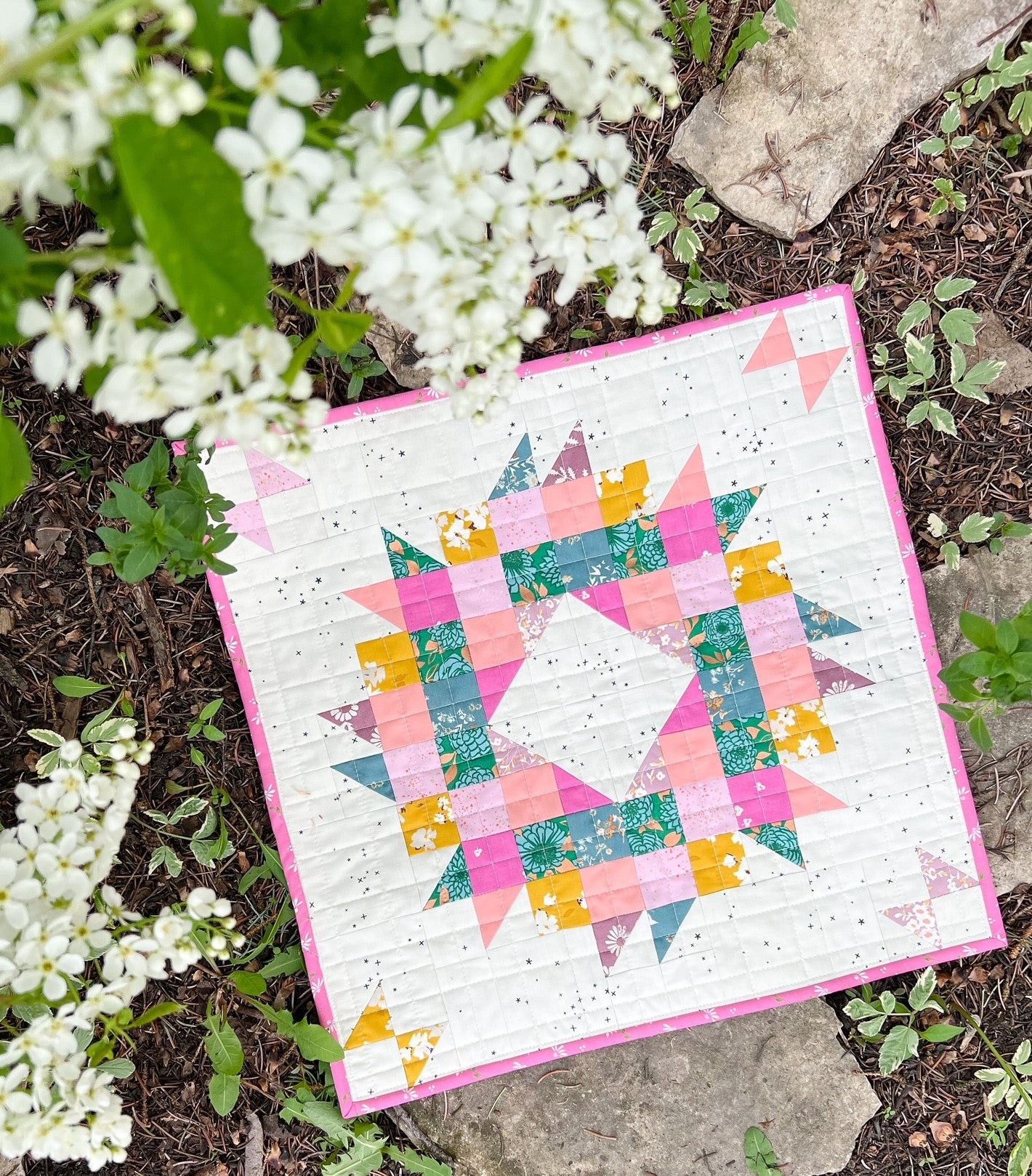 This quilt design is perfect for using up small scrap pieces of fabric to create the pixelated wreath of flowers. There is also a fun twist if you put multiple minis together to create a throw quilt!